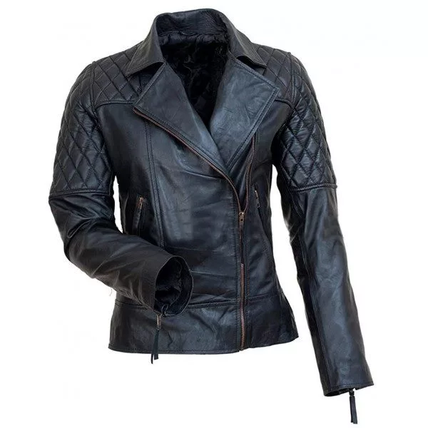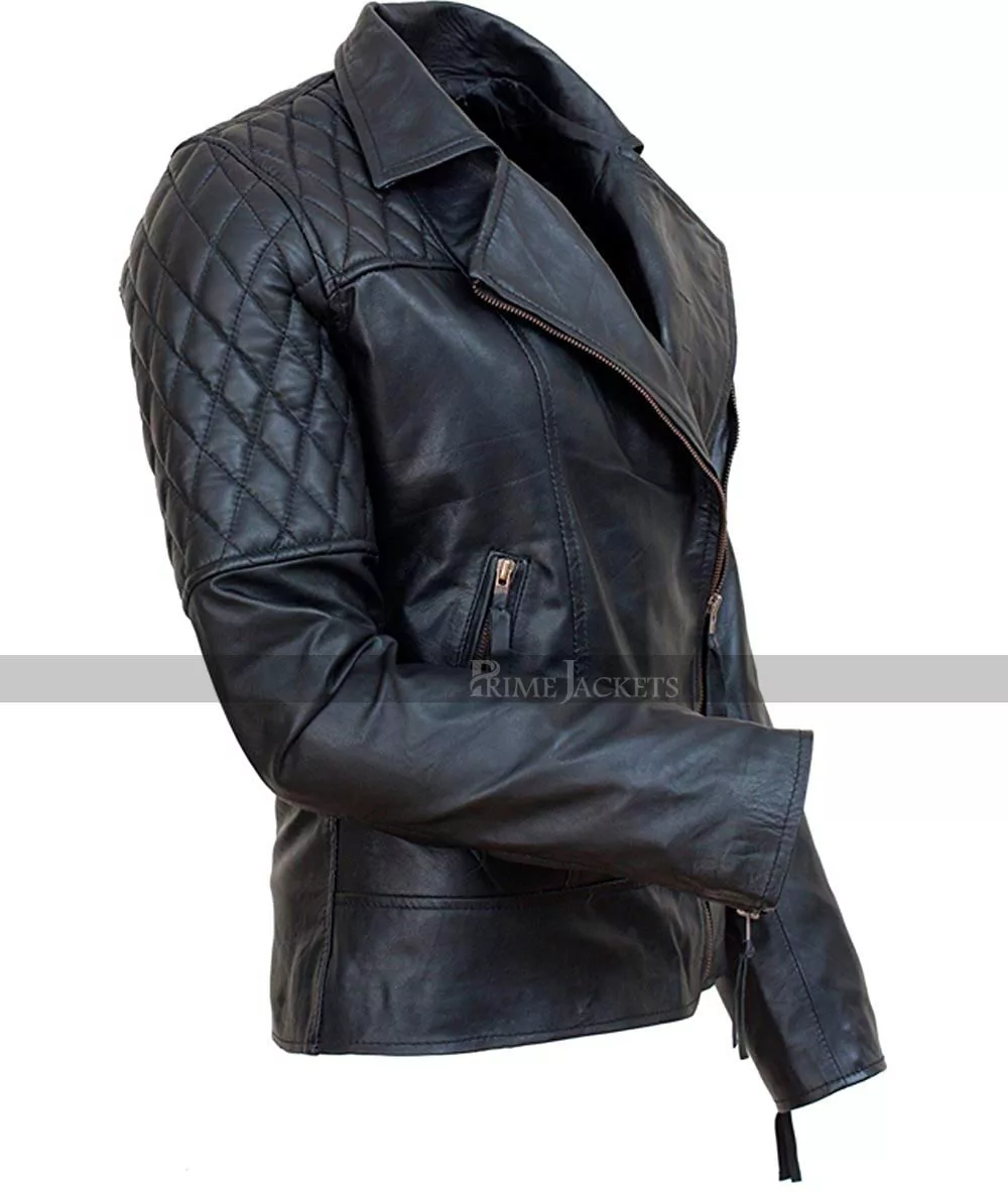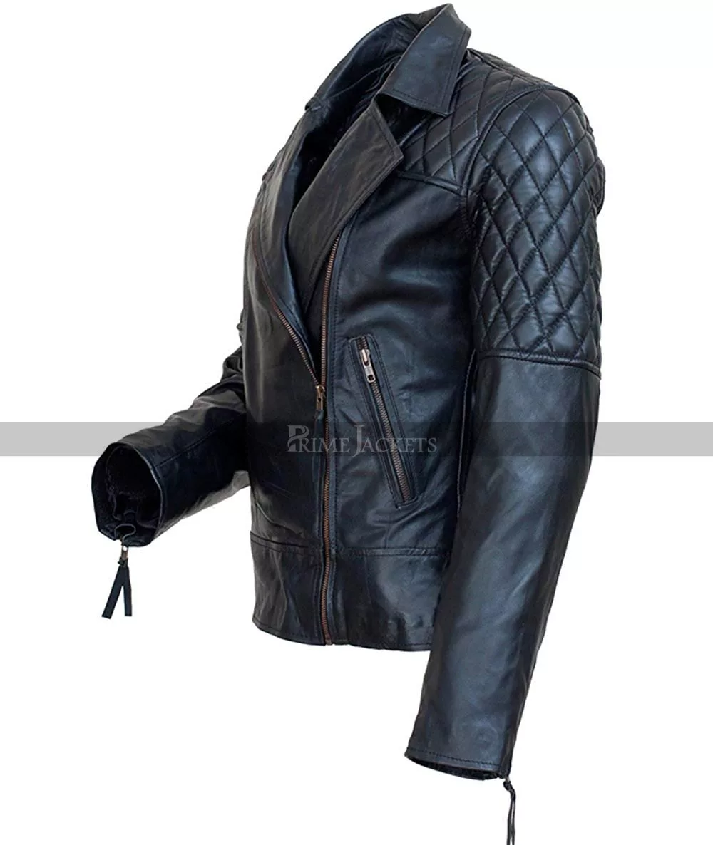 Ornament your personality with this classic piece of leather from the style roster of the beautiful Canadian singer Avril Lavigne. The jacket is fantastically created with premium leather to satisfy the taste palate of all female fashion mongers. With its captivating black quilted pattern at front and backside; the jacket denotes all design elements added with high attention to details. It has a captivating lapel style collar and a full front asymmetric zippered closure. There are two zippered pockets on both side and sleeves are trimmed in an appealing silhouette with zippers at cuffs. Enjoy a refined, tasteful appearance at the fullest and add this stunning leather wear into your closet right now.