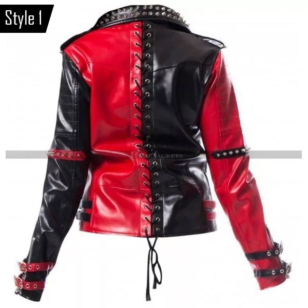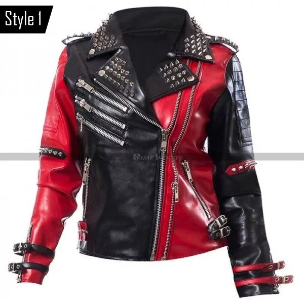 The idea which we brought to life; for you, is an inspiration from fictional character form American comics: “HARLEY QUINN”. Get in a new style by this Harley Quinn Biker Studded Jacket, boasted in Red and Black color. It is specially crafted for you in Faux Leather. For comfort and durability, it carries Viscose Lining. It is featured in stylish Lapel Notch collar. It has Two Side Waist, Zipper Front & Inside Pockets. It carries Full Sleeves with Zipper Cuffs style with a stylishly looking Asymmetric Front Zipper Closure.