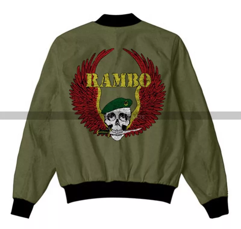 Rambo Last Blood is the first of the Rambo series of movies done by Hollywood actor Sylvester Stallone. This rambo green satin jacket is a must have for you if you are a diehard fan of Rambo. The highlight of this bomber jacket is of course, the graphics of human skull and the wings of an eagle embroidered on the back. Rib knit pattern on the collar, cuffs, and waist give this jacket a very sporty look. This lightweight jacket keeps you relaxed and comfortable while giving a big boost to your personality.