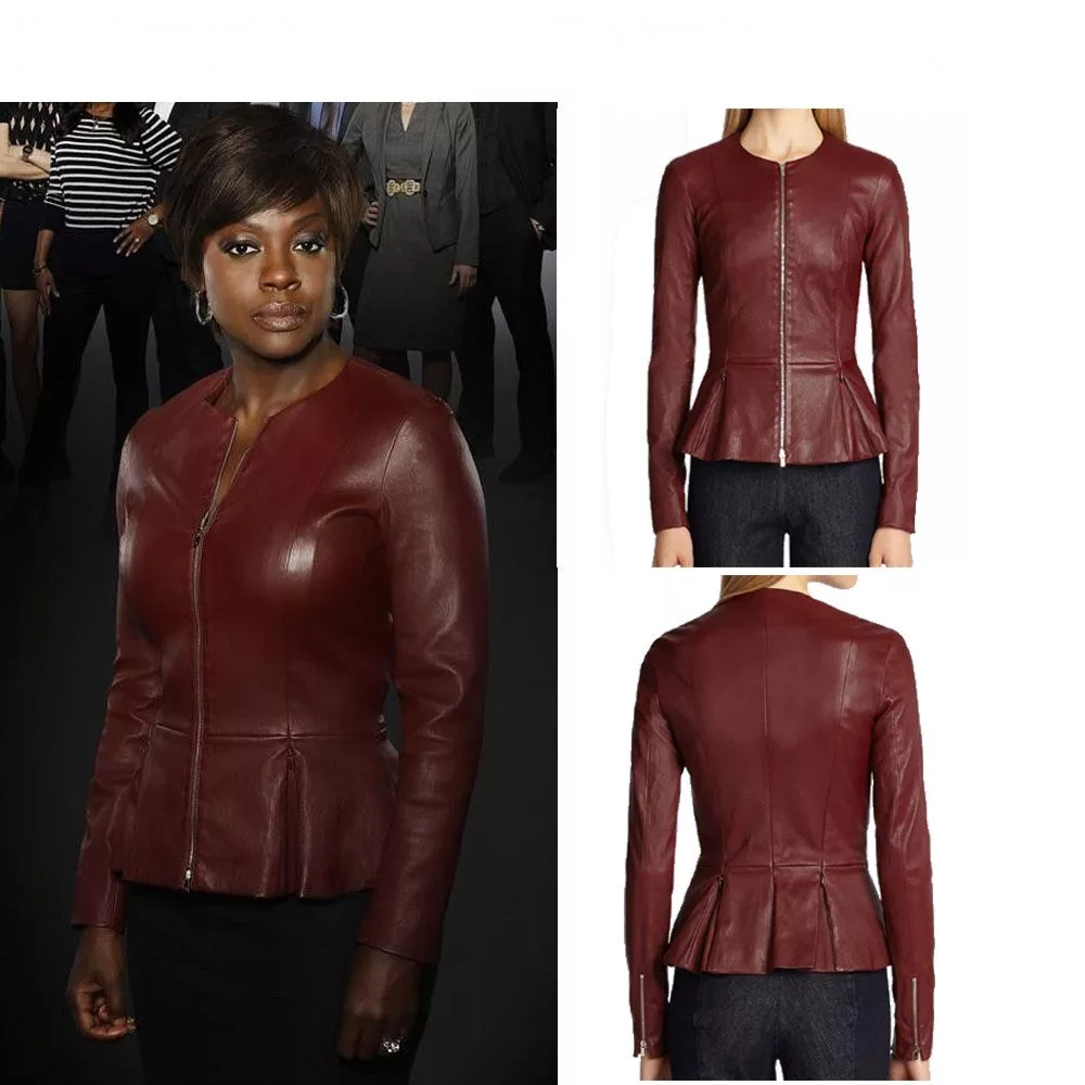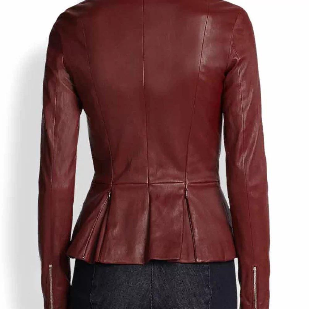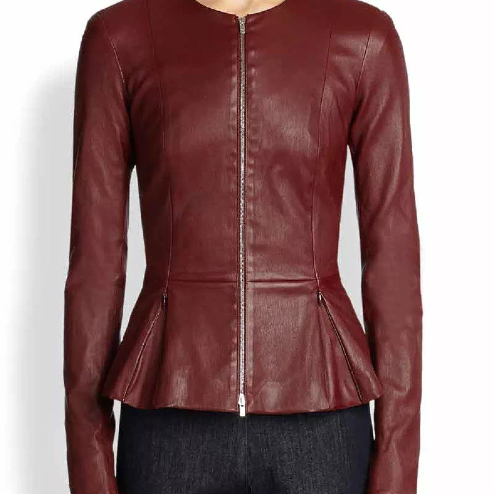Round Neck Collar Style Maroon Peplum Leather Jacket
