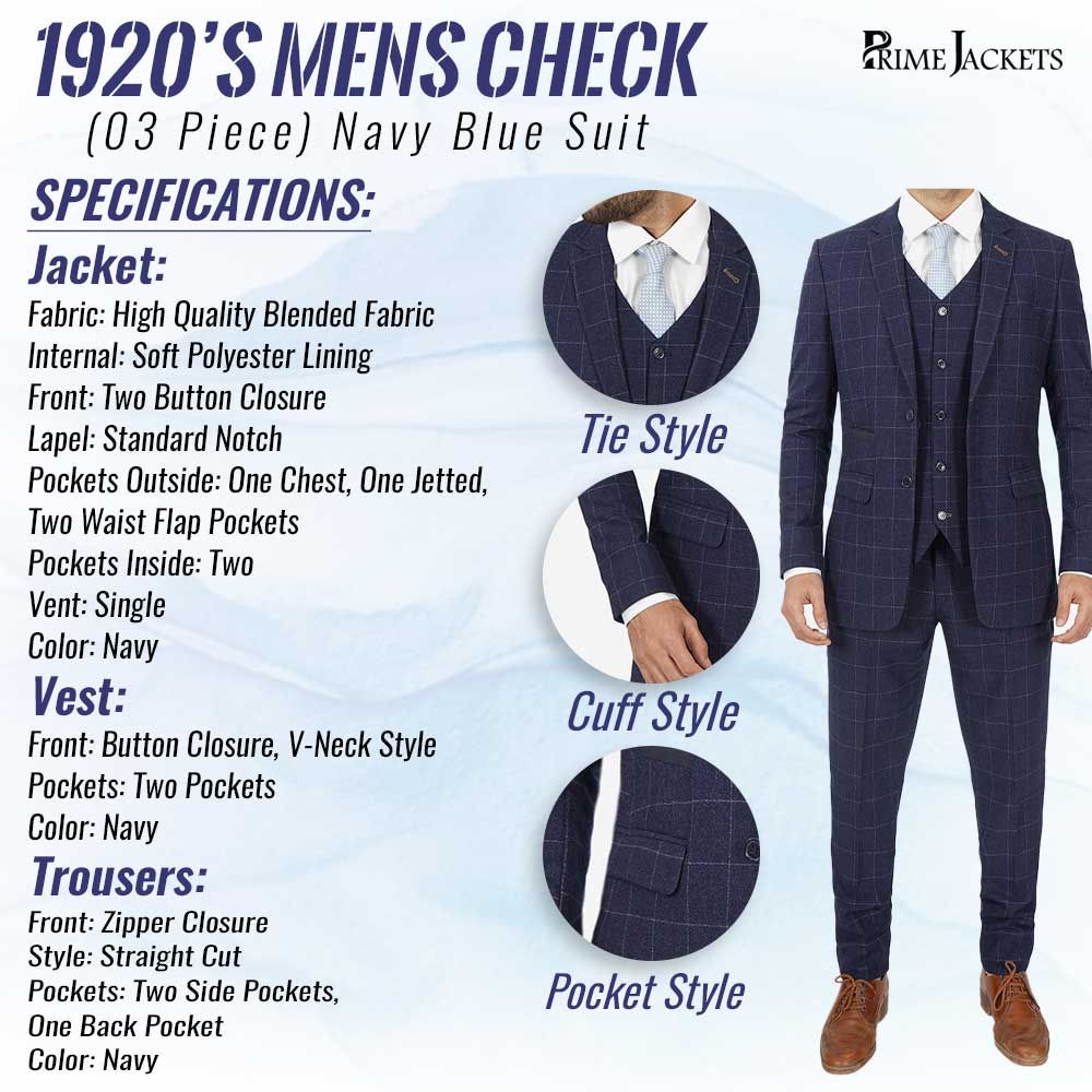 This outerwear which we made from high-quality blended Material that is 100% assured, and you’ll feel warm because it has an inner lining made of soft polyester. The collar with the standard notch lapel design fits well. Full-length sleeves that terminate in basic design cuffs are finished with buttons in the front of the outfit for a comfortable fit. Two side waist pockets and one chest pocket, and one jetted pocket on the apparel make it easier to carry things and give it a more fashionable appearance. The 3 Piece Navy Blue Check Suit is available in a navy blue color that increases its value.