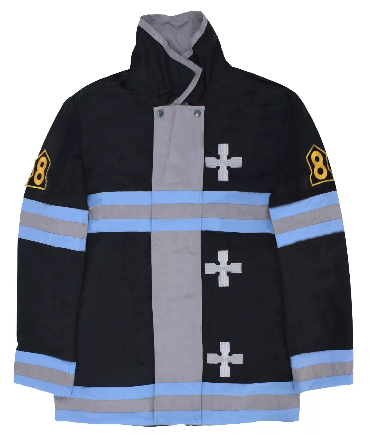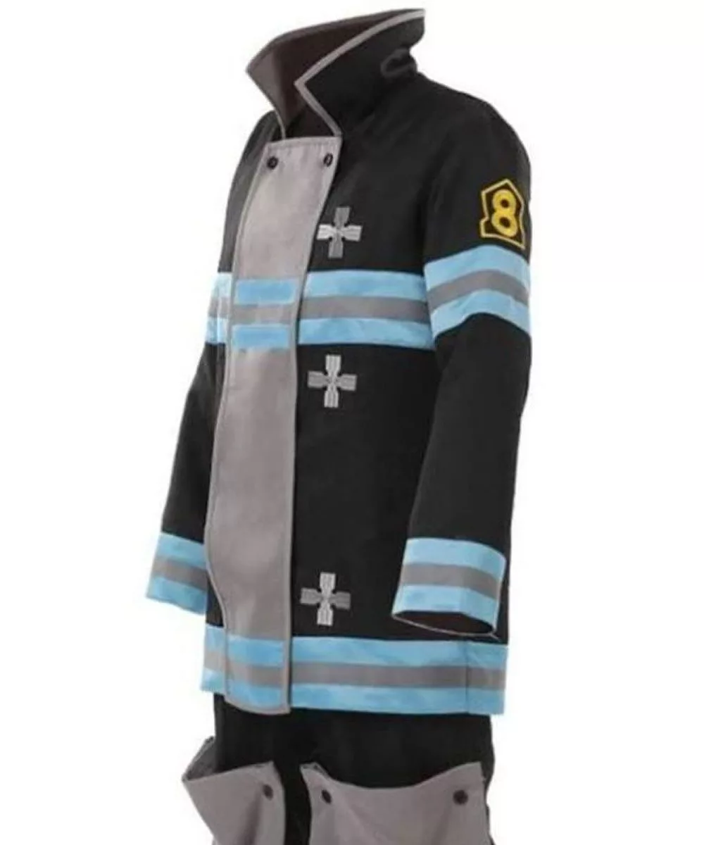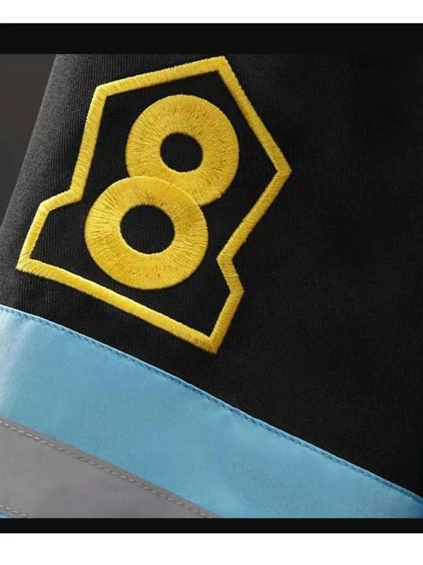 Shinra Kusakabe Fire Force Jacket was the smash hit of the season that is purely made from fleece fabric. It is just the best option to transform your wardrobe into something very fancy. The jacket is available in black color with blue and grey strips on the hemline, chest, and sleeves, it has a stand-up collar and buttoned closure. The sleeves of the long and fitted design with stylish open hem cuffs, the inside material of the jacket are of soft viscose lining and consist of two inner pockets to hold your stuff. The back has a grey cross and the front has the three crosses along with the number 8 in yellow on the sleeves. This Shinra Kusakabe Jacket is tailored perfectly to complement your special events.